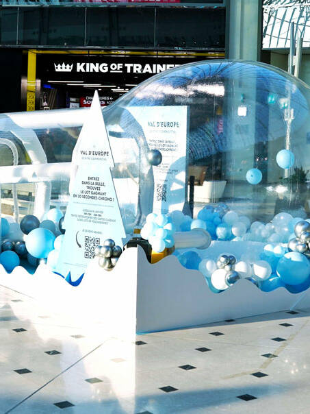 Découvrez notre nouvelle bulle d'hiver géante, une solution unique qui va bien au-delà de la simple décoration pour créer des expériences mémorables tout au long de cette période festive. Que ce soit pour marquer les soldes d'hiver, célébrer Noël, ou accueillir le Nouvel An, notre installation est conçue pour s'adapter à chaque occasion, captivant ainsi vos visiteurs dès leur arrivée. Notre bulle d'hiver devient un point de convergence enchanté dans votre centre commercial.